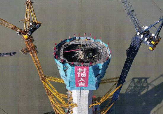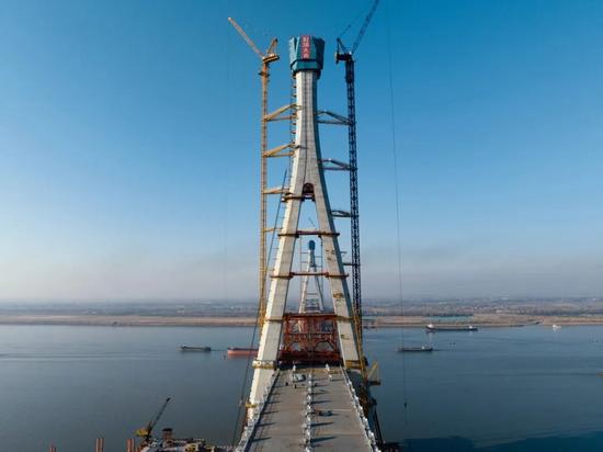 這是大橋兩座主塔中首個封頂?shù)闹魉?/span>