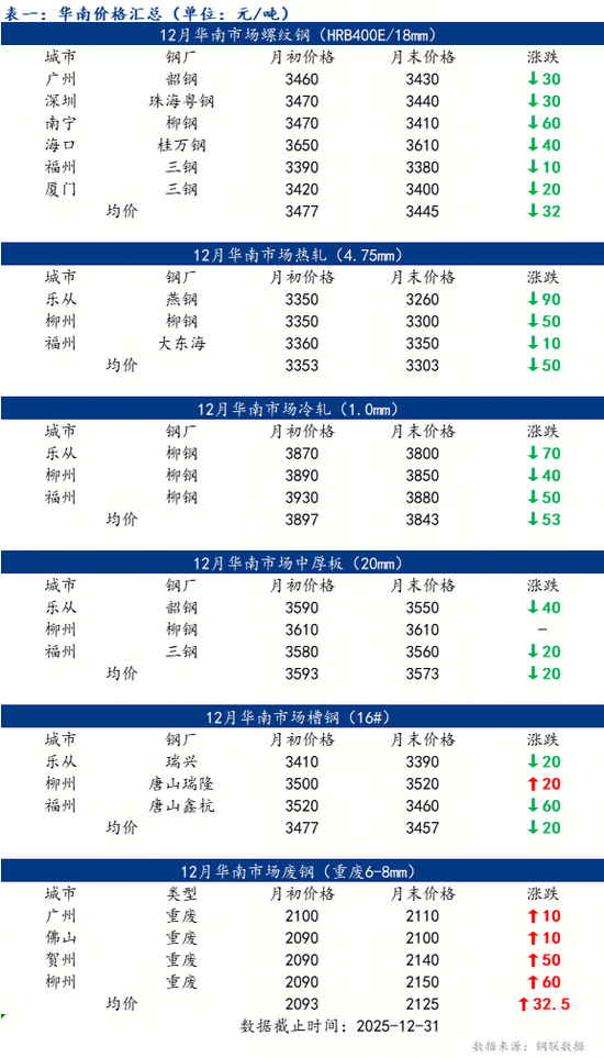 表1:12月華南各品種價格漲跌一覽表 (單位:元/噸)