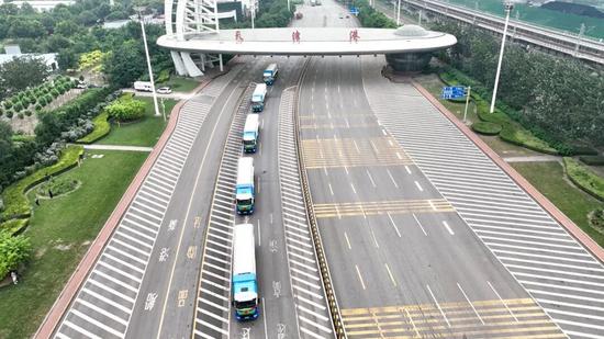 圖為滿載貨物后的榮程氫能重卡駛離天津港