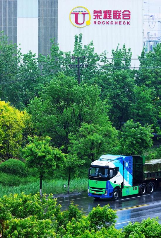 圖為榮程氫能重卡在廠區(qū)運(yùn)行