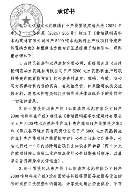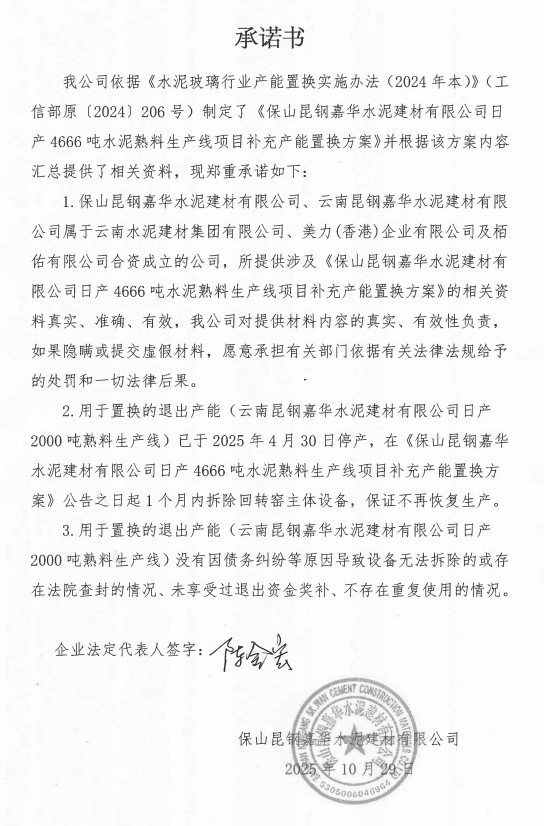 保山昆鋼嘉華水泥建材有限公司日產4666噸水泥熟料生產線補充產能項目產能置換方案