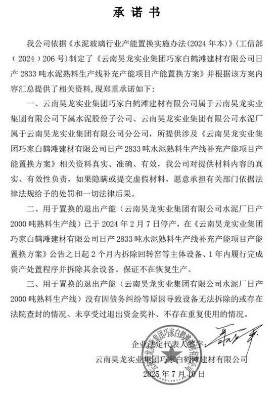 根據(jù)公告,云南昊龍實業(yè)集團巧家白鶴灘建材有限公司日產2833噸水泥熟料生產線原備案或核準文件設計產能2000t/d,補充產能833t/d,置換產能1250t/d,置換比例為1.5:1。云南昊龍實業(yè)集團有限公司水泥廠一條2000t/d水泥熟料線中的1250t/d用于本項目置換產能,該生產線目前已關停,計劃自本產能置換方案公告之日起2個月內拆除回轉窯。