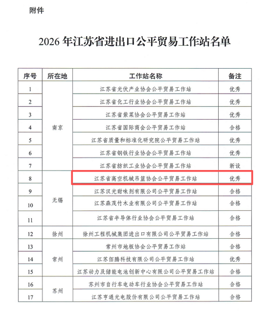 2026月,江蘇省商務(wù)廳公布了2026年江蘇省進(jìn)出口公平貿(mào)易工作站名單,江蘇省高空機(jī)械吊籃協(xié)會(huì)公平貿(mào)易工作站憑借在國際市場開拓、貿(mào)易摩擦應(yīng)對(duì)、合規(guī)服務(wù)賦能等領(lǐng)域的顯著工作成效,再度獲評(píng)“省優(yōu)秀公平貿(mào)易工作站”。這是該工作站自成立以來第八次獲此榮譽(yù),體現(xiàn)了主管部門對(duì)其持續(xù)深耕行業(yè)服務(wù)、助力企業(yè)高質(zhì)量 “走出去”的認(rèn)可,也見證了工作站在復(fù)雜國際經(jīng)貿(mào)環(huán)境中不斷創(chuàng)新突破的堅(jiān)實(shí)足跡。