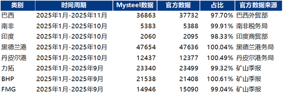 從數(shù)據(jù)核驗(yàn)結(jié)果來(lái)看,Mysteel 統(tǒng)計(jì)的全球鐵礦石發(fā)運(yùn)數(shù)據(jù)與各主要產(chǎn)礦國(guó)官方披露的發(fā)運(yùn)量基本吻合。其中,澳大利亞、南非的統(tǒng)計(jì)數(shù)據(jù)與兩國(guó)官方出口量偏差均控制在 1% 以內(nèi);與印度官方出口量的偏差為 1.67%;與巴西官方出口量的偏差則為 2.3%。這一偏差的核心成因在于,巴西存在部分鐵礦石通過(guò)內(nèi)陸河道運(yùn)輸并出口的情況,該部分貨源未被納入海運(yùn)發(fā)運(yùn)統(tǒng)計(jì)口徑。