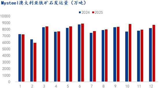 據(jù) Mysteel 全球鐵礦石發(fā)運(yùn)量數(shù)據(jù)統(tǒng)計(jì),2025 年澳大利亞鐵礦石發(fā)運(yùn)量突破 9.6 億噸,同比增加 2400 萬(wàn)噸,創(chuàng)下歷史新高,占全球鐵礦石發(fā)運(yùn)增量的 60%。