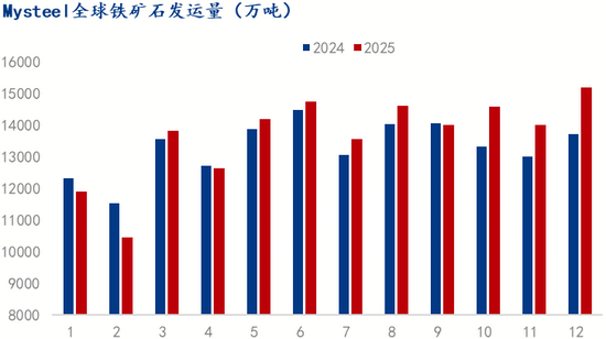 2025 年,Mysteel 統(tǒng)計(jì)全球鐵礦石發(fā)運(yùn)量約 16.38 億噸(12 月數(shù)據(jù)為預(yù)估數(shù)據(jù),下同),同比增加 4200 萬(wàn)噸,增幅約 2.6%。