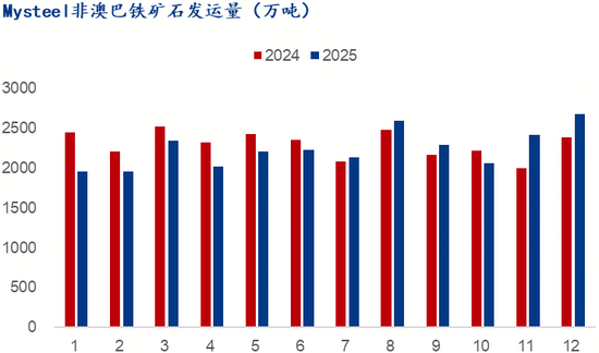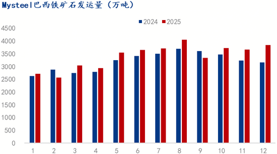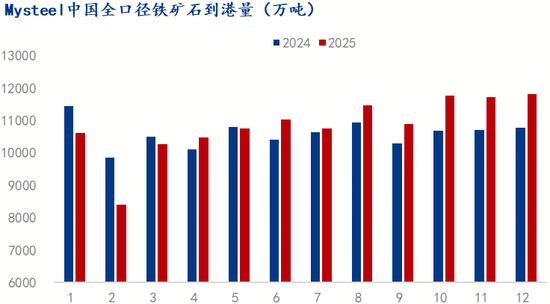 同期,海關(guān)總署統(tǒng)計(jì),2025年鐵礦石進(jìn)口量預(yù)計(jì)12.6億噸,同比增加2300萬(wàn)噸,增幅1.97%;絕對(duì)值和增幅與Mysteel統(tǒng)計(jì)基本一致;