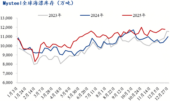對(duì)比全球鐵礦石發(fā)運(yùn)量增量來(lái)看,中國(guó)到港量增量低于發(fā)運(yùn)端增量,這一差異主要由海漂庫(kù)存變動(dòng)所致。2025 年海漂庫(kù)存同比增加 900 萬(wàn)噸,在途貨源規(guī)模擴(kuò)大,進(jìn)而導(dǎo)致到港量未能與發(fā)運(yùn)量實(shí)現(xiàn)同步增長(zhǎng)。