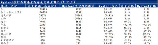 因此,若僅從絕對(duì)值角度看待 2025 年 1—11 月的數(shù)據(jù),容易產(chǎn)生 Mysteel 鐵礦石到港量高于海關(guān)進(jìn)口數(shù)據(jù)的 “錯(cuò)覺(jué)”。將海關(guān)進(jìn)口量折算為濕噸后,Mysteel 統(tǒng)計(jì)數(shù)據(jù)占海關(guān)總量的 95.16%,誤差控制在 5% 以內(nèi);若扣除陸運(yùn)環(huán)節(jié)的進(jìn)口數(shù)據(jù),Mysteel 統(tǒng)計(jì)數(shù)據(jù)占海關(guān)海運(yùn)進(jìn)口量的 98%,誤差不足 2%。
