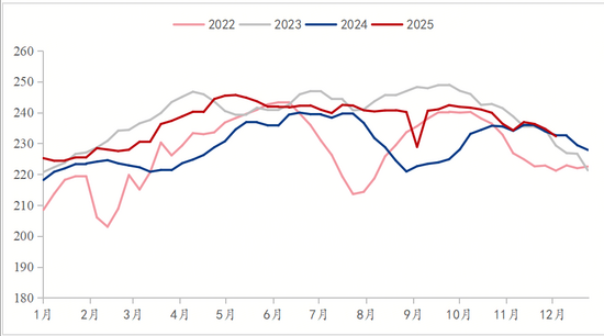 2025年煉焦煤需求保持較強(qiáng)韌性,但對(duì)煉焦煤行情拉動(dòng)并不明顯,從需求強(qiáng)度看,下游焦鋼企業(yè)總體生產(chǎn)穩(wěn)定,政策性減產(chǎn)方案暫未體現(xiàn)。上半年煉焦煤需求有增,但增速相比供應(yīng)端環(huán)節(jié)較為緩慢,產(chǎn)業(yè)基本面維持寬松格局,下半年煉焦煤剛性需求高位震蕩,同時(shí)伴隨庫(kù)存低位補(bǔ)庫(kù)以及冬儲(chǔ)補(bǔ)庫(kù)預(yù)期下,下半年市場(chǎng)投機(jī)需求有所釋放。根據(jù)Mysteel調(diào)研247家鋼廠日均鐵水產(chǎn)量數(shù)據(jù)評(píng)估,2025年煉焦煤表內(nèi)消費(fèi)量同比增2.6%,剛需韌性較強(qiáng)。