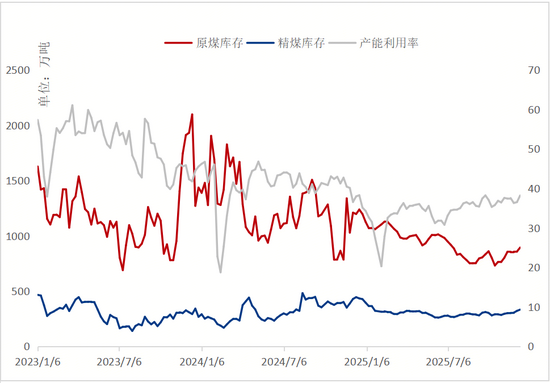 從上游端庫(kù)存的角度看,2025年煤礦端開(kāi)工率保持平穩(wěn)波動(dòng),除一月份農(nóng)歷春節(jié)假期外整體開(kāi)工率在80%區(qū)間內(nèi)窄幅震蕩波動(dòng)運(yùn)行。2025年均值為84.28%略低于2024年的86.15%,據(jù)Mysteel調(diào)研數(shù)據(jù)顯示,全國(guó)314家洗煤廠樣本全年平均開(kāi)工率為34.48%,同比減少6.02%。而庫(kù)存方面也能看到較去年小幅減少,全年平均水平相較2024年低10萬(wàn)噸左右。截至2025年12月中旬,據(jù)Mystee調(diào)研數(shù)據(jù)顯示,全國(guó)314家洗煤廠樣本原煤庫(kù)存893.92萬(wàn)噸,同比減少303.78萬(wàn)噸,降幅25.36%;精煤庫(kù)存332.37萬(wàn)噸,同比減少113.01萬(wàn)噸,降幅25.37%。2025年,旺季不旺,淡季不淡的特征導(dǎo)致洗煤廠庫(kù)存整體高位逐漸回落,精煤維持安全庫(kù)存區(qū)間。