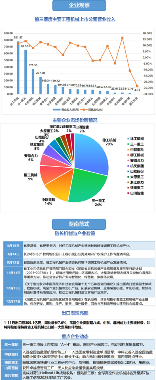 鏈長密集調(diào)研與部署產(chǎn)業(yè)發(fā)展,省委常委、省紀(jì)委書記、時任省工程機(jī)械產(chǎn)業(yè)鏈鏈長魏建鋒,省政協(xié)副主席、省工程機(jī)械產(chǎn)業(yè)鏈鏈長何寄華等多次深入三一、山河智能、國重智聯(lián)等企業(yè)開展一線調(diào)研,為工程機(jī)械產(chǎn)業(yè)持續(xù)高質(zhì)量發(fā)展提供保障。頂層設(shè)計與規(guī)劃支撐重點布局工程機(jī)械產(chǎn)業(yè),省工信廳組織編制《湖南省工程機(jī)械產(chǎn)業(yè)“十五五”發(fā)展思路研究》,《關(guān)于制定長沙市國民經(jīng)濟(jì)和社會發(fā)展第十五個五年規(guī)劃的建議》《湖南省農(nóng)機(jī)裝備產(chǎn)業(yè)高質(zhì)量發(fā)展三年行動計劃(2025—2027年)》《湖南工程機(jī)械產(chǎn)業(yè)國際化經(jīng)營合規(guī)指引》等為產(chǎn)業(yè)發(fā)展指明方向,推動工程機(jī)械打造世界級產(chǎn)業(yè)集群。