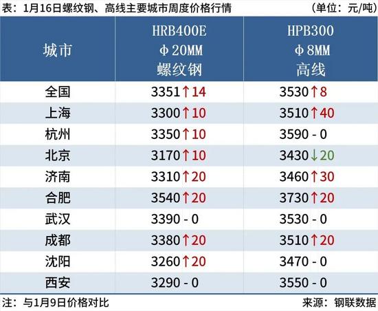 截至1月16日,全國主要城市20mm三級抗震螺紋鋼均價3351元/噸,周環(huán)比上漲14元/噸;8.0mmHPB300高線均價3530元/噸,周環(huán)比上漲8元/噸。