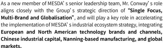 馬丁·康威身為美斯達(dá)決策團(tuán)隊(duì)的新生力量,將精準(zhǔn)契合美斯達(dá)“單聚焦、多品牌、全球化”的戰(zhàn)略主線推進(jìn)發(fā)展,能夠有效推動(dòng)“歐美技術(shù)品牌渠道 + 中國(guó)產(chǎn)業(yè)資本 + 南寧制造 + 全球市場(chǎng)”產(chǎn)業(yè)生態(tài)理念的具體實(shí)施。