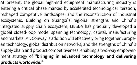 當(dāng)前,全球高端裝備制造業(yè)處于“技術(shù)迭代加速、競(jìng)爭(zhēng)格局重塑、生態(tài)體系重構(gòu)”的關(guān)鍵階段。美斯達(dá)集團(tuán)憑借廣西的區(qū)位優(yōu)勢(shì)和中國(guó)完備的供應(yīng)鏈體系,逐步構(gòu)建起由技術(shù)、資本、制造、市場(chǎng)相互聯(lián)動(dòng)的全球化閉環(huán)。馬丁·康威的加盟,可將歐洲技術(shù)、全球渠道與中國(guó)供應(yīng)鏈優(yōu)勢(shì)、產(chǎn)品競(jìng)爭(zhēng)力等多種優(yōu)勢(shì)有效融合,達(dá)成“引進(jìn)來、走出去”的雙向賦能。