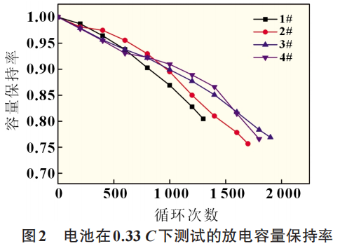 在溫度為25℃,采用4種不同循環(huán)策略條件對(duì)電池進(jìn)行了近2000次循環(huán)測(cè)試。圖1是電池在4種循環(huán)策略下的放電容量保持率。圖2是每200次循環(huán)在0.33C倍率下測(cè)試的放電容量保持率。圖2在0.33C標(biāo)定的容量衰減趨勢(shì)與圖1一致。從圖1可以看出,1#電池在0.5C倍率下循環(huán)1300次后,容量保持率為81.2%;2#電池在1C倍率下循環(huán)到1300次,容量保持率為82.8%;3#電池在2C倍率下循環(huán)到1300次,容量保持率為89.4%;4#電池在階梯充電策略下循環(huán)到1300次,容量保持率為89.6%。