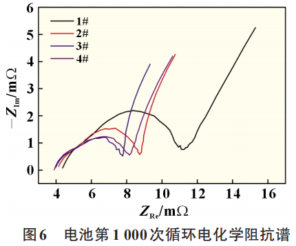 從圖5中可以看出,從1000次循環(huán)開(kāi)始,電池內(nèi)阻增長(zhǎng)速度變快,根據(jù)內(nèi)阻增長(zhǎng)值排序依次為2#(1C)>3#(2C)>1#(0.5C)>4#(階梯充)。圖6為電池在4種循環(huán)策略條件下第1000次循環(huán)的電化學(xué)阻抗譜。從圖6可以看出,4種不同循環(huán)策略電芯的電化學(xué)阻抗譜中半圓弧大小依次為:1#>2#>4#>3#,這部分與電化學(xué)反應(yīng)時(shí)的電荷轉(zhuǎn)移阻抗相關(guān),不同循環(huán)倍率下的電荷轉(zhuǎn)移阻抗差別較大,尤其是在0.5C循環(huán)的1#電芯電荷轉(zhuǎn)移阻抗最大。