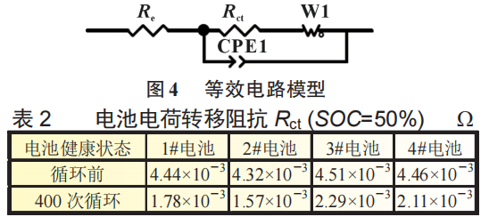 采用如圖4所示的等效電路模型分別對(duì)電池循環(huán)前和循環(huán)400次的電化學(xué)阻抗譜進(jìn)行擬合,主要目的就是通過(guò)擬合來(lái)研究電荷轉(zhuǎn)移阻抗的變化,擬合結(jié)果見(jiàn)表2。從擬合結(jié)果可以看出,電池在4種循環(huán)策略進(jìn)行循環(huán)充放電時(shí),在400次循環(huán)的電荷轉(zhuǎn)移阻抗相比循環(huán)前降低,這也導(dǎo)致了圖5中直流內(nèi)阻的減小。