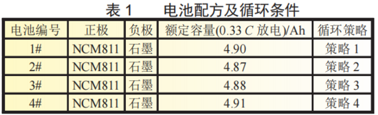 本文研究中所用電池為疊片軟包電池,正極采用NCM811材料,負(fù)極采用石墨材料。由于要測(cè)試4種不同倍充放電循環(huán),電池相對(duì)應(yīng)的編號(hào)為1#,2#,3#,4#,電壓使用區(qū)間2.5~4.2V,電池的相關(guān)信息見(jiàn)表1。