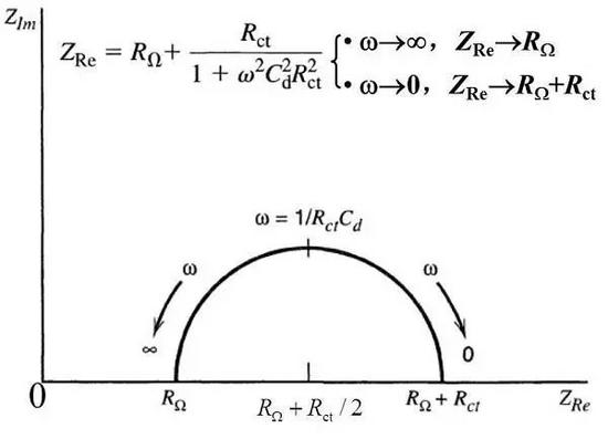 電極過程的控制步驟為電化學(xué)反應(yīng)步驟時,Nyquist圖為半圓,據(jù)此可以判斷電極過程的控制步驟。從Nyquist圖上可以直接求出RW和Rct。由半圓頂點的w可求得Cd。