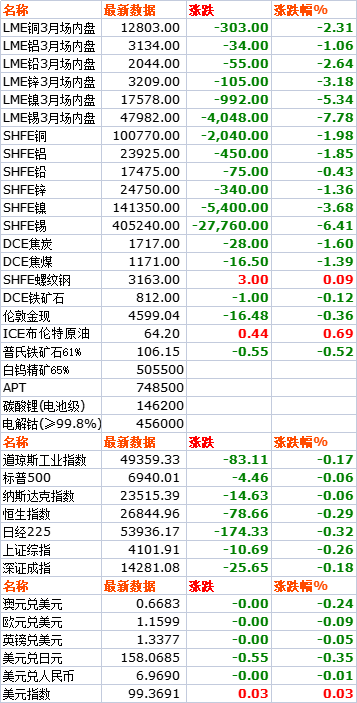 16日,LME六種基本金屬價格全線下跌。三月期銅價收于12803美元噸,下跌2.31%。三月期鋁價收于3134美元噸,下跌1.06%。三月期鉛價收于2044美元噸,下跌2.64%。三月期鋅價收于3209美元噸,下跌3.18%。三月期錫價收于47982美元噸,下跌7.78%。三月期鎳價收于17578美元噸,下跌5.34%