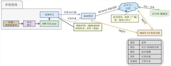 通信架構(gòu)服務(wù)于全生命周期工況的連續(xù)跟蹤與快速響應(yīng),針對井場分散、環(huán)境惡劣的特點(diǎn),采用“專線+5G”雙活冗余接入與SD-WAN智能選路,保障在荒漠、弱覆蓋區(qū)仍能實(shí)現(xiàn)分鐘級數(shù)據(jù)采集與秒級指令下發(fā),滿足排水采氣等工藝對控制實(shí)時(shí)性的苛刻要求(P95時(shí)延≤2 s),支撐多階段協(xié)同的網(wǎng)絡(luò)與拓?fù)溥壿嬋鐖D2所示。