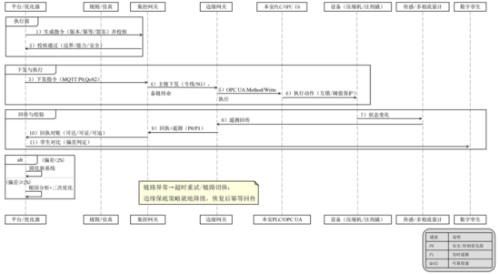 (3)通信與可證性方面,指令下發(fā)采用主備鏈路冗余與消息簽名、回執(zhí)對賬及端到端追蹤 ID,確保“可達(dá)、可證、可追”;異常情況下啟用邊緣保底策略就地降級,并在鏈路恢復(fù)后進(jìn)行冪等回填,最大限度減少執(zhí)行偏差與生產(chǎn)擾動。