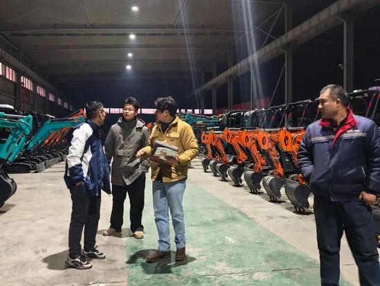 隨后,客商來到產(chǎn)品展示區(qū),現(xiàn)場體驗了挖掘機的操控性能,并重點考察了電動裝載機、滑移裝載機等明星機型。山鼎集團工作人員對設備的動力系統(tǒng)、液壓穩(wěn)定性及智能化控制功能進行了詳細講解,客商不時提出專業(yè)問題,雙方就北美市場的設備適配需求展開了熱烈探討。在夜間的技術交流環(huán)節(jié),客商還與團隊一同核對技術參數(shù),針對美國市場的認證標準與使用場景優(yōu)化提出了具體建議。