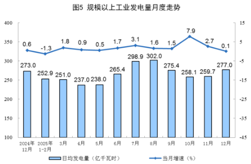 規(guī)上工業(yè)電力生產(chǎn)保持增長(zhǎng)。12月份,規(guī)上工業(yè)發(fā)電量8586億千瓦時(shí),同比增長(zhǎng)0.1%;日均發(fā)電量277.0億千瓦時(shí)。1—12月份,規(guī)上工業(yè)發(fā)電量97159億千瓦時(shí),同比增長(zhǎng)2.2%。
