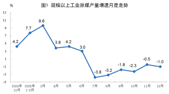 原煤產(chǎn)量穩(wěn)中略降。12月份,規(guī)上工業(yè)原煤產(chǎn)量4.4億噸,同比下降1.0%;日均產(chǎn)量1410萬噸。