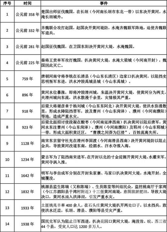 黃河除了自然決口之外,人為決口的“以水代兵”事件屢有發(fā)生。據(jù)史料記載,歷史上至少出現(xiàn)過14次此類事件。