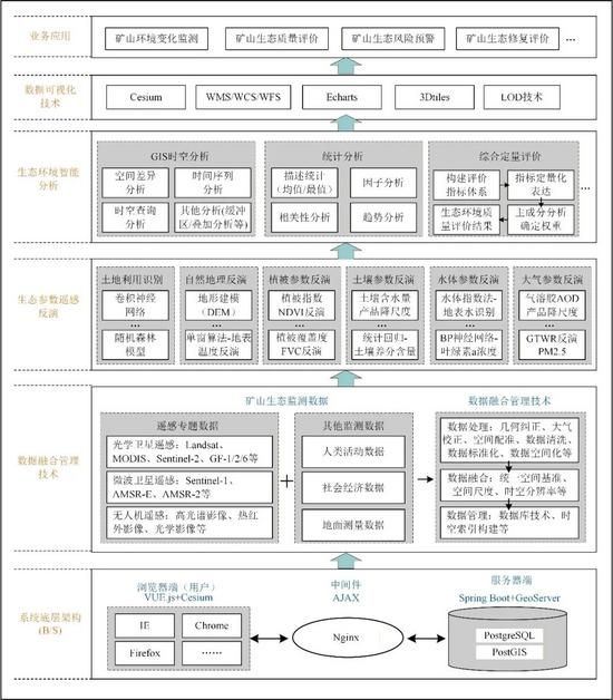 系統(tǒng)采用無(wú)插件、組件化的B/S(瀏覽器/服務(wù)器)架構(gòu),包括多源大數(shù)據(jù)融合管理、生態(tài)參數(shù)定量遙感智能反演、生態(tài)環(huán)境智能分析與綜合評(píng)價(jià)、數(shù)據(jù)可視化技術(shù)等核心內(nèi)容。
