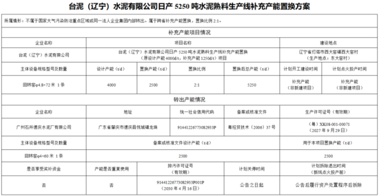根據(jù)《臺泥(遼寧)水泥有限公司日產(chǎn)5250噸水泥熟料生產(chǎn)線補充產(chǎn)能置換方案》顯示,廣州石井德慶水泥廠有限公司一條2500t/d水泥熟料線用于臺泥(遼寧)水泥有限公司5250t/d水泥熟料線補充產(chǎn)能項目,該生產(chǎn)線計劃在公告后履行資產(chǎn)處置程序后拆除。
