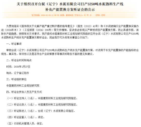2026年1月20日,遼寧省工業(yè)和信息化廳發(fā)布《關(guān)于組織召開臺泥(遼寧)水泥有限公司日產(chǎn)5250噸水泥熟料生產(chǎn)線補充產(chǎn)能置換方案聽證會的公示》顯示,臺泥(遼寧)水泥有限公司日產(chǎn)5250噸水泥熟料生產(chǎn)線補充產(chǎn)能置換方案聽證會將于2026年1月27日召開。聽證會主要內(nèi)容摘要如下: