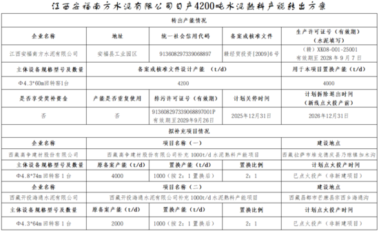 根據公告,江西安福南方水泥有限公司將4200t/d水泥熟料線中的4000t/d,通過產能轉讓方式,用于西藏高爭建材股份有限公司4000t/d水泥熟料線、西藏開投海通水泥2000t/d水泥熟料線產能補齊,置換比例為2︰1。該生產線計劃2026年12月31日前拆除退出。