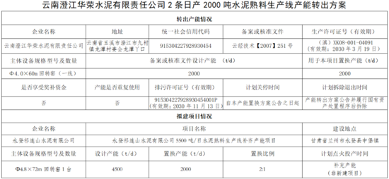 根據(jù)公告,云南澄江華榮水泥有限責(zé)任公司2條2000t/d水泥熟料線產(chǎn)能,分別用于永登和天水祁連山水泥有限公司5500t/d水泥熟料生產(chǎn)線補齊產(chǎn)能項目,置換比例均為2:1,該生產(chǎn)線計劃產(chǎn)能轉(zhuǎn)出方案公告并履行國有資產(chǎn)處置程序后拆除。