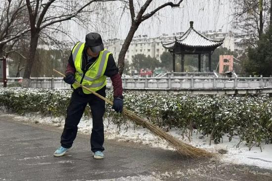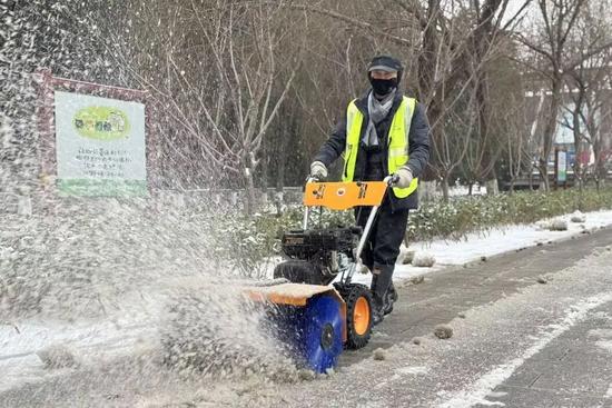 ▲對機械清理后的公園道路進行清掃,防止路面結(jié)冰