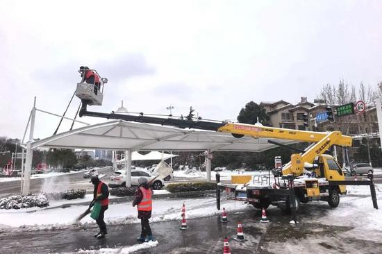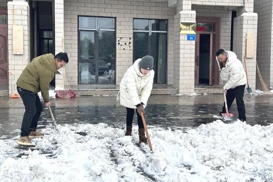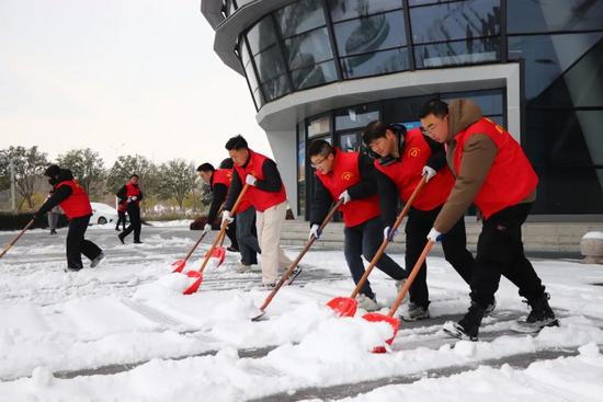 ▲六安市體育中心項目集結(jié)70余名黨員及青年團員組成除雪突擊隊,對中心主干道展開全方位積雪清理作業(yè),確保積雪“即下即清、不留死角”。