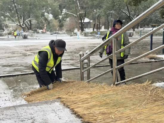 ▲對公園樓梯、廊道等易滑關(guān)鍵地段鋪設(shè)防滑草墊