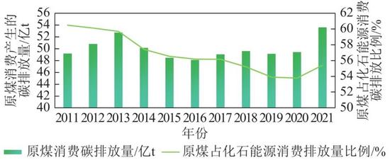 圖6 2011—2021年我國原煤消費(fèi)所產(chǎn)生的二氧化碳排放量及其占化石能源排放量比例