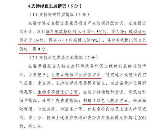 據(jù)了解,基金投資的企業(yè)、項(xiàng)目每年碳減排比例大于等于5%的,得3分;碳減排比例小于5%的,得分=3×(碳減排比例/5%),其中碳減排比例為負(fù)值的,得0分。