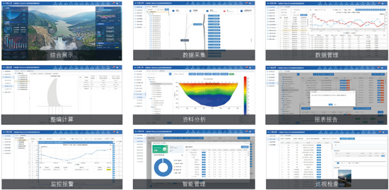 基于通用化設計和微服務架構,深度融合安全監(jiān)測理論與方法,在無縫集成自動化采集系統(tǒng)基礎上,開發(fā)并部署了白鶴灘水電站安全監(jiān)測智能管理系統(tǒng)(見下圖)。系統(tǒng)涵蓋數(shù)據(jù)采集、數(shù)據(jù)管理、整編計算、資料分析、報表報告、監(jiān)控報警、智能管理、巡視檢查、工程管理、系統(tǒng)管理、綜合展示等功能模塊,實現(xiàn)了監(jiān)測業(yè)務的全流程數(shù)字化、智能化管理。