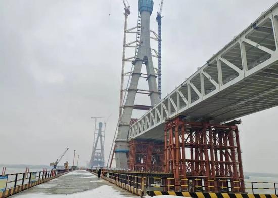 1月19日,剛剛完成大橋4號(hào)主塔封頂?shù)某刂蓍L(zhǎng)江大橋,也迎來(lái)今年首場(chǎng)風(fēng)雪洗禮。大雪蒼茫,長(zhǎng)江浩蕩,大橋主塔巍然聳立,作業(yè)平臺(tái)和已架設(shè)鋼梁上被白雪覆蓋,現(xiàn)場(chǎng)寧?kù)o肅然,看不到作業(yè)痕跡。