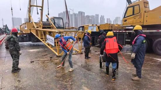 在長(zhǎng)沙湘江特大橋東、西岸的棧橋施工現(xiàn)場(chǎng),作業(yè)人員冒著嚴(yán)寒,手持鐵鍬、掃帚,配合手推車播撒環(huán)保融雪劑,對(duì)人行通道鋪設(shè)防滑墊。大家分工明確,有的清理橋面浮冰,有的對(duì)吊車支腿等設(shè)備關(guān)鍵部位進(jìn)行防滑處理,確保大型起重設(shè)備行走區(qū)域無(wú)結(jié)冰、無(wú)積水,所有吊裝作業(yè)均有專業(yè)指揮并增設(shè)纜風(fēng)繩。作業(yè)人員嚴(yán)格落實(shí)安全防護(hù)要求,全員穿戴防滑鞋、反光背心,臨水作業(yè)人員額外配備救生衣,在保障效率的同時(shí)筑牢安全防線。