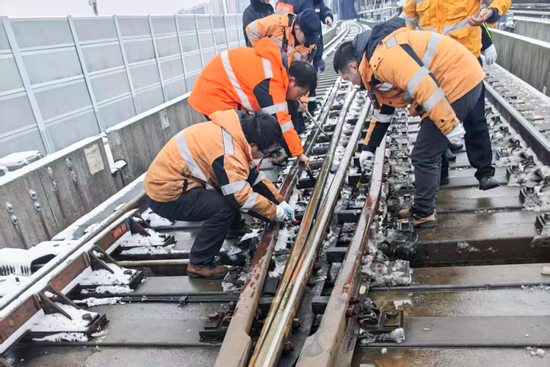 中國(guó)鐵建電氣化運(yùn)管公司北京西郊線及興延高速維保項(xiàng)目部即刻激活應(yīng)急機(jī)制,管理團(tuán)隊(duì)靠前指揮,深入一線督導(dǎo)積雪清理、設(shè)備巡檢等工作,現(xiàn)場(chǎng)協(xié)調(diào)解決突發(fā)問(wèn)題。各班組快速集結(jié)、備足物資,按預(yù)案開(kāi)展防控。工務(wù)與信號(hào)人員對(duì)鋼軌、道岔拉網(wǎng)式排查,清理積雪、處置結(jié)冰隱患;供電人員24小時(shí)值守,監(jiān)測(cè)設(shè)備狀態(tài)、防控各類(lèi)隱患,全力保障了西郊線、興延高速各系統(tǒng)平穩(wěn)有序運(yùn)行。