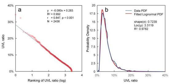 (1)城市空地在全國(guó)尺度上符合齊夫定律,城市空地總面積與城市規(guī)模呈冪律關(guān)系,而城市的空地率(UVL ratio)服從對(duì)數(shù)正態(tài)分布且與城市規(guī)模無(wú)顯著相關(guān);