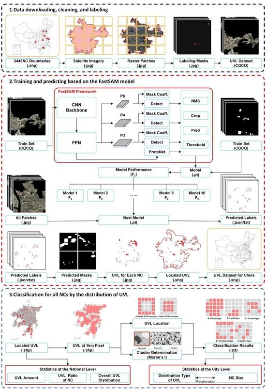 本研究基于深度學(xué)習(xí)模型系統(tǒng)開(kāi)展了中國(guó)城市空地的識(shí)別與空間分布分析(見(jiàn)圖1)。研究對(duì)象為全國(guó)2446座實(shí)體城市(Natural Cities, NCs),其邊界基于建成區(qū)的空間連續(xù)性和人口活動(dòng)強(qiáng)度識(shí)別而成,并設(shè)置5 km2的最小面積閾值。研究首先獲取2023年高分辨率遙感影像(約1.19 m),將其處理為55670幅影像切片(2520×2520像素),并通過(guò)X-AnyLabeling平臺(tái)人工標(biāo)注5548幅樣本,構(gòu)建符合COCO標(biāo)準(zhǔn)的城市空地訓(xùn)練數(shù)據(jù)集。隨后,采用輕量化的Fast Segment Anything(FastSAM)模型進(jìn)行訓(xùn)練與預(yù)測(cè),模型在100個(gè)epoch下獨(dú)立訓(xùn)練10次,選取性能最佳的模型作為最終版本,并以F2值評(píng)估模型精度。通過(guò)ArcGIS實(shí)現(xiàn)預(yù)測(cè)結(jié)果的矢量化與空間配準(zhǔn),最終生成覆蓋全國(guó)實(shí)體城市的城市空地矢量數(shù)據(jù)庫(kù)。