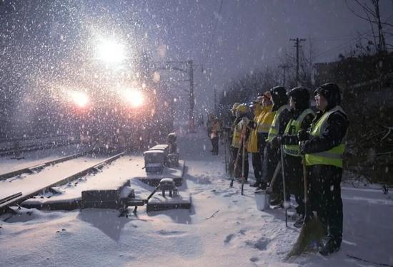 宜昌綜合維修段以雪為令,第一時(shí)間啟動(dòng)寒潮防御應(yīng)急預(yù)案,采用鏟冰、涂油、噴火槍融冰等方式,迅速組織人員對(duì)管內(nèi)各站區(qū)道岔積雪進(jìn)行清掃,保障行車安全。