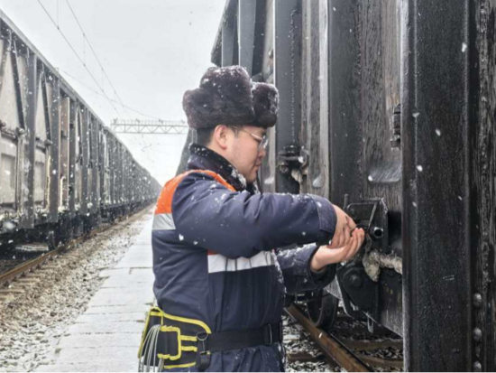 南倉站緊盯雪天作業(yè)安全,貨運(yùn)檢查員對(duì)車輛裝載加固進(jìn)行檢查,清掃線路積雪,確保貨運(yùn)列車安全運(yùn)行。