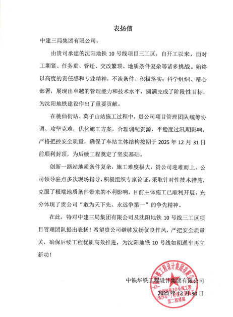 沈陽(yáng)地鐵10號(hào)線三、四工區(qū)項(xiàng)目面對(duì)工期緊、任務(wù)重、地質(zhì)復(fù)雜等挑戰(zhàn),團(tuán)隊(duì)始終科學(xué)組織、攻堅(jiān)克難,順利實(shí)現(xiàn)了桃仙街站、莫子山站主體結(jié)構(gòu)按期封頂,并在創(chuàng)新一路站復(fù)雜地質(zhì)條件下積極克服困難、推進(jìn)施工,展現(xiàn)出高度的責(zé)任感、專(zhuān)業(yè)水平和“爭(zhēng)先”精神,為沈陽(yáng)地鐵高質(zhì)量發(fā)展作出重要貢獻(xiàn)。